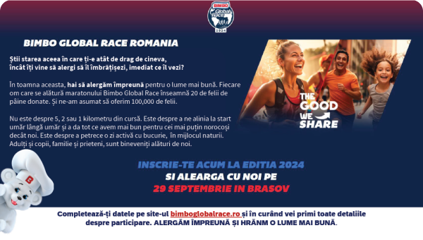 Te inscrii la Global Bimbo Race in sectiunea “Quests” si pe 29 Septembrie, la ora 10:00 fugi cu noi pt o lume mai buna.